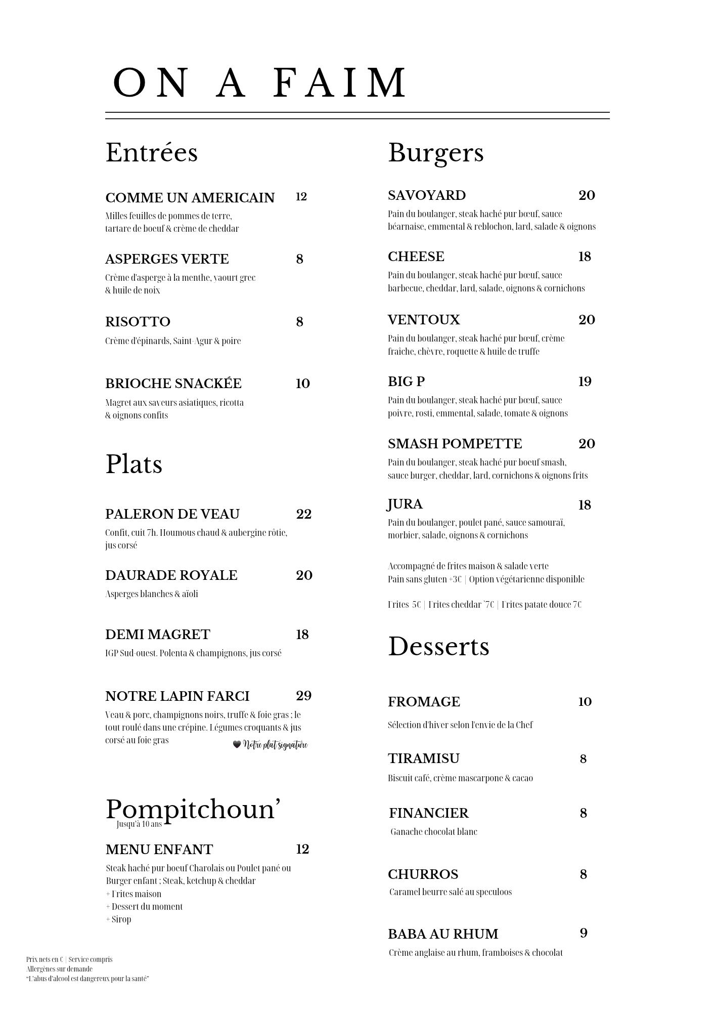 Chaque carte est élaborée en fonction des produits de saison. Les mettre en valeur est notre priorité afin de pouvoir vous offrir une cuisine inventive et authentique reflétant l'art de vivre en Provence. La carte change souvent, elle met en avant une cuisine bistronomique créative en désaccord avec une gamme de burgers complètement streetfood mais chez Pompette cela ne choque pas.